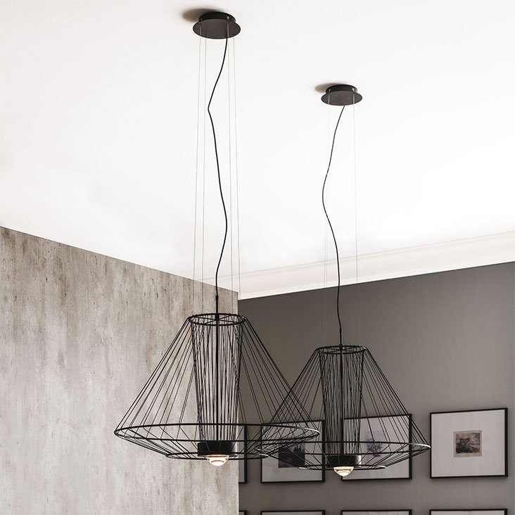 Потолочная люстра со структурой из стали, окрашенной в матовый черный OP17 и с удлиняющимся абажуром из черного каучука. Лампочка включена.