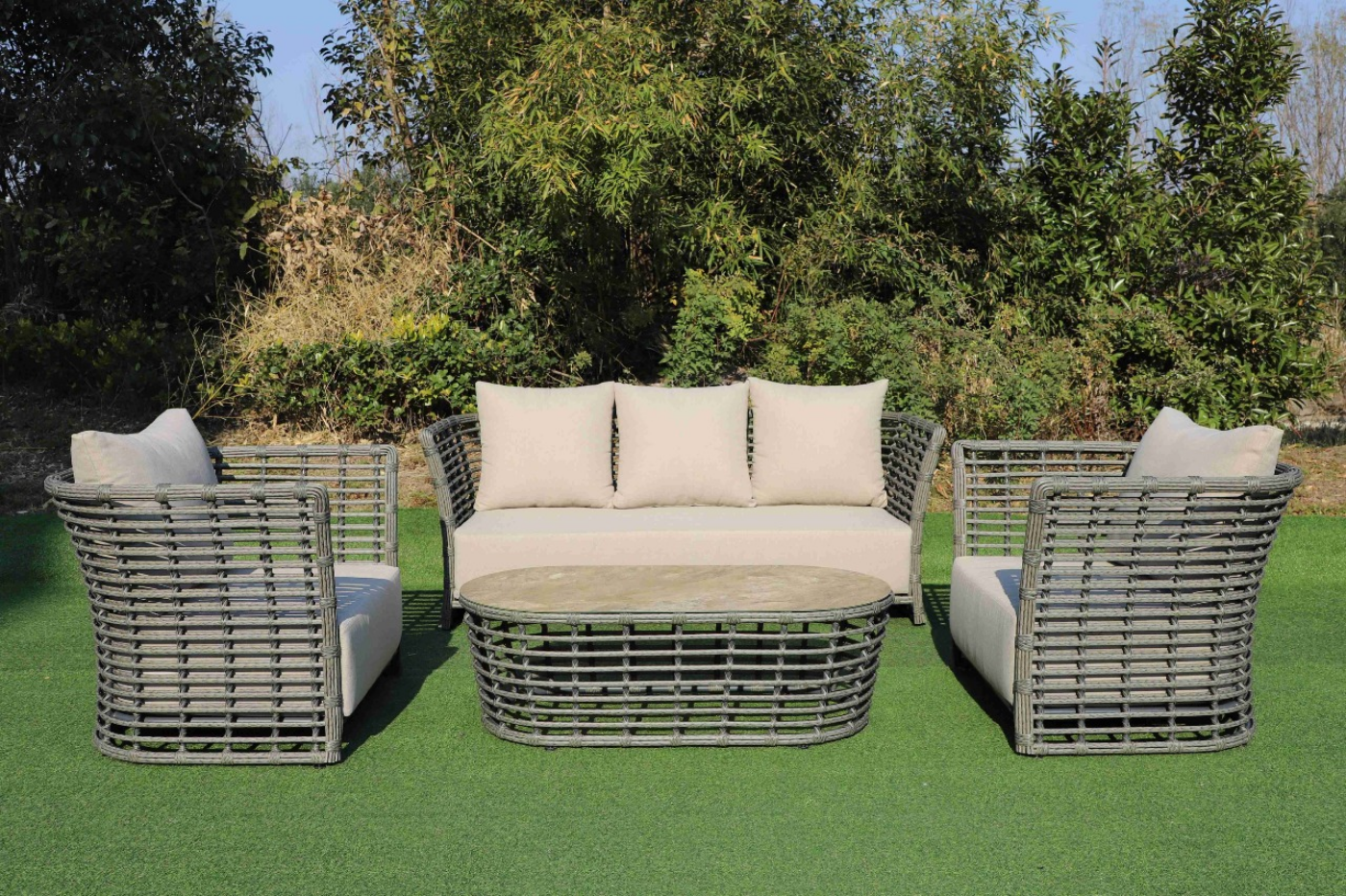 Ручное круглое плетение является основным декоративным элементом мебели. Оно выполнено из искусственного ротанга в сером цвете.