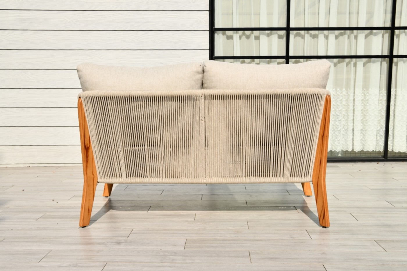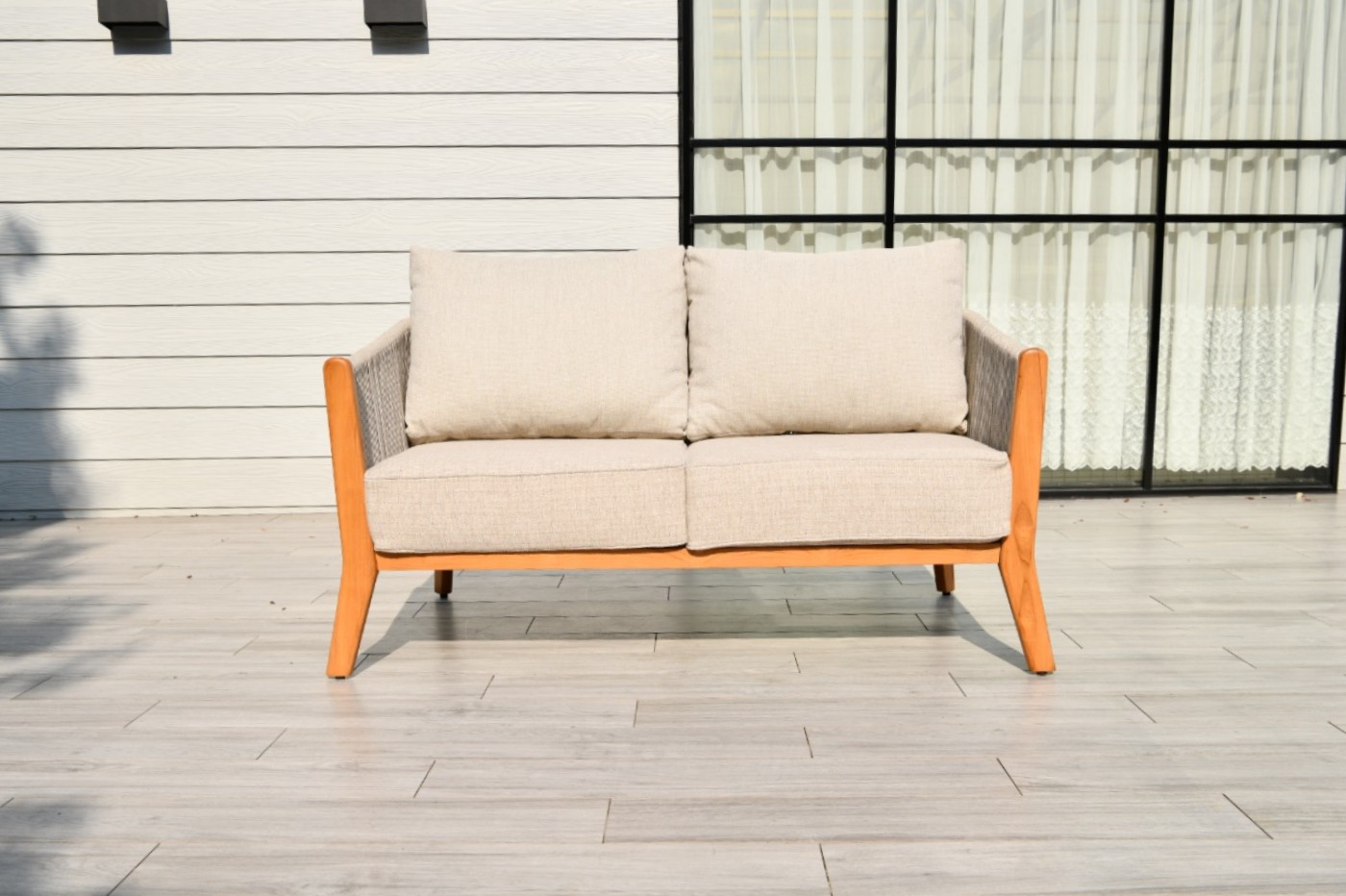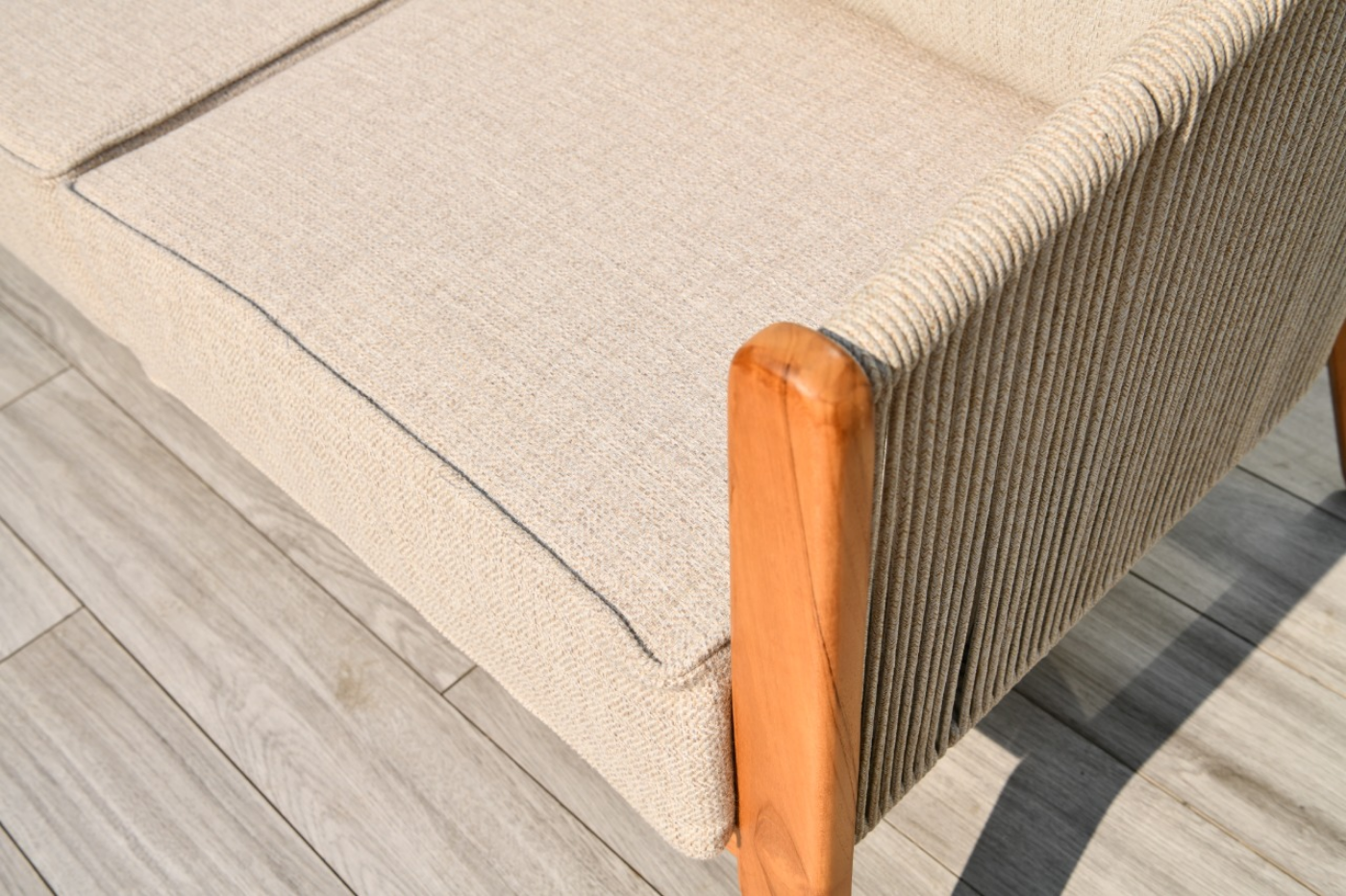 "Сидней" диван 2-местный плетеный из роупа, основание тик, каркас алюминий бежевый, роуп бежевый, ткань бежевая