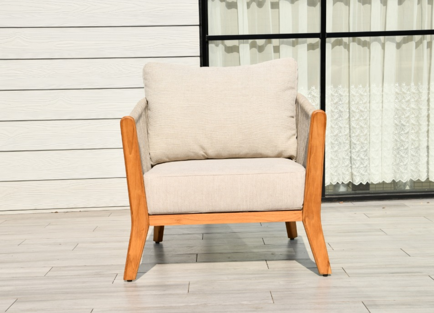 Основание кресла - тик, каркас из алюминия бежевого оттенка.