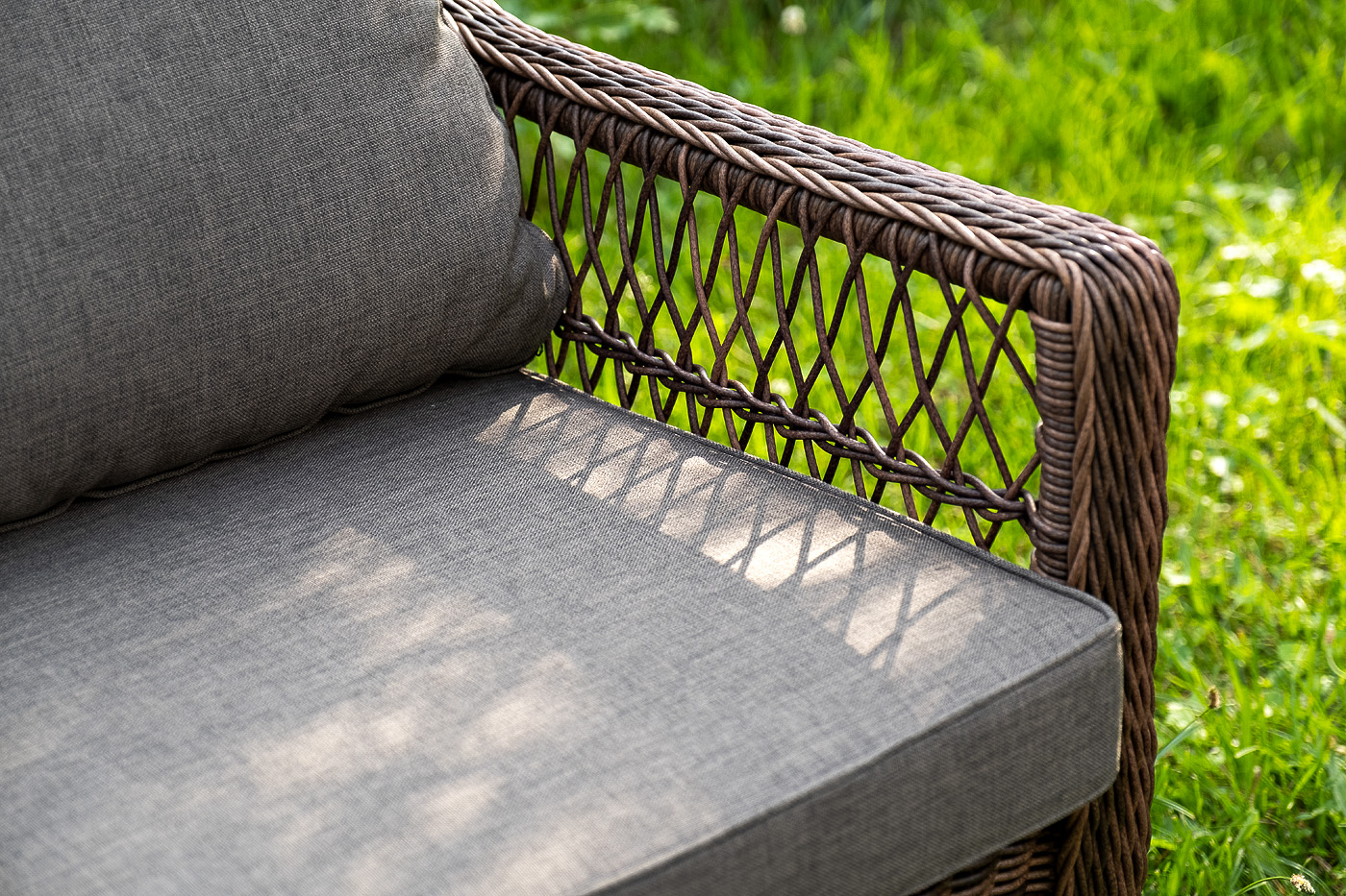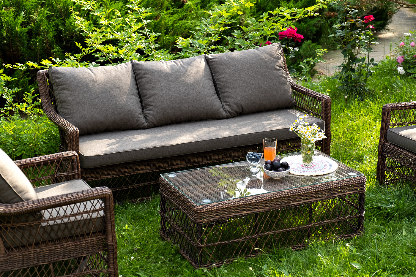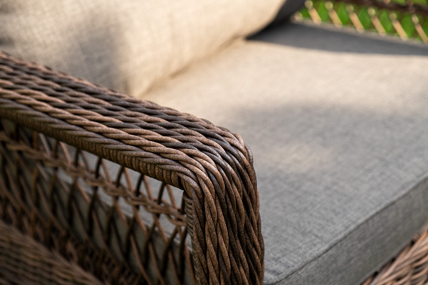 Уличная мебель имеет алюминиевый каркас, ручное плетение, сделанное из коричневого искусственного ротанга. Предусмотрены мягкие подушки из полиэстера серо-коричневого цвета с плотностью 230гр/м2. Они имеет влагоотталкивающую пропитку. Рабочая поверхность столика изготовлена из закаленного стекла толщиной 5 мм.