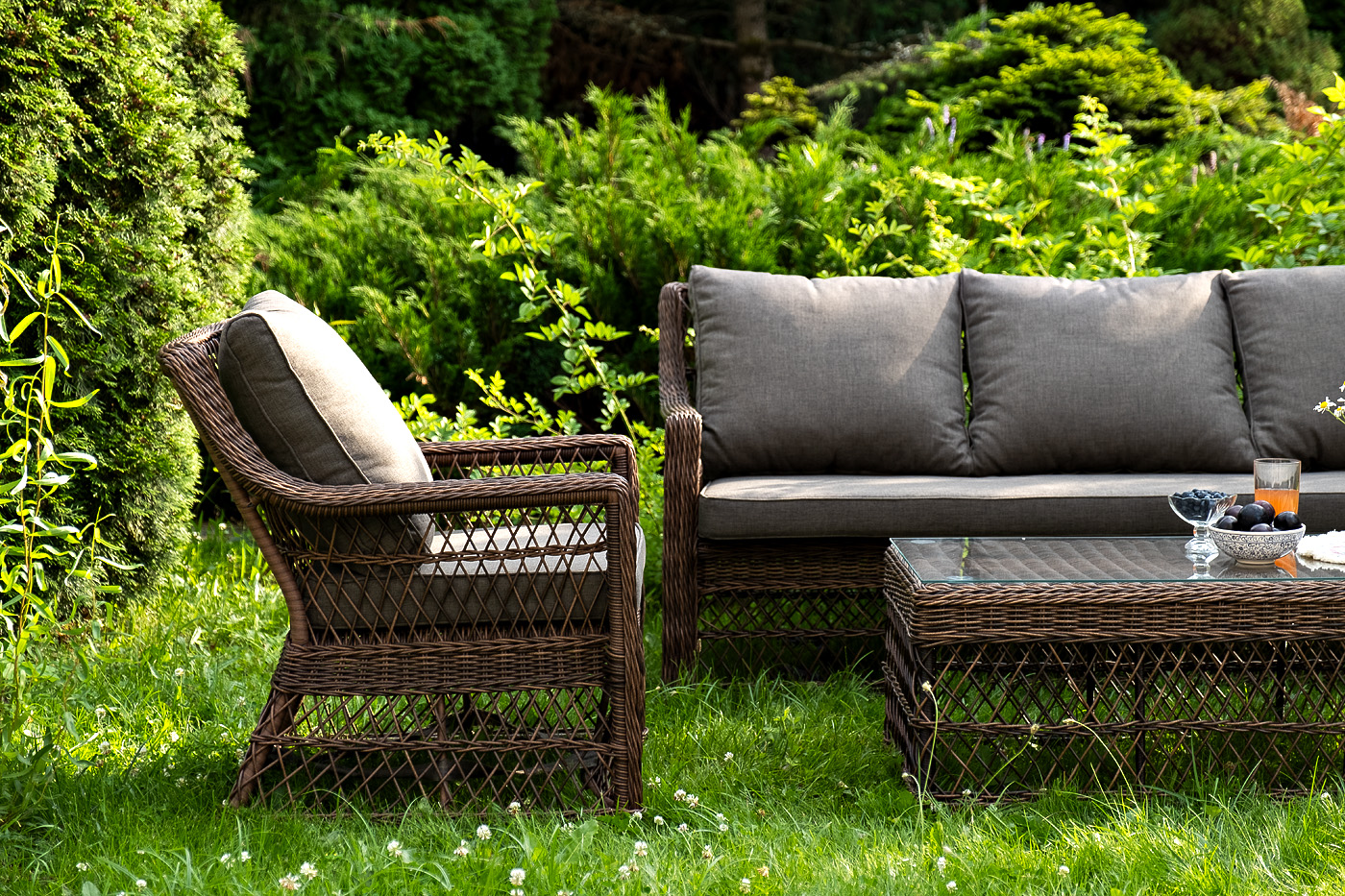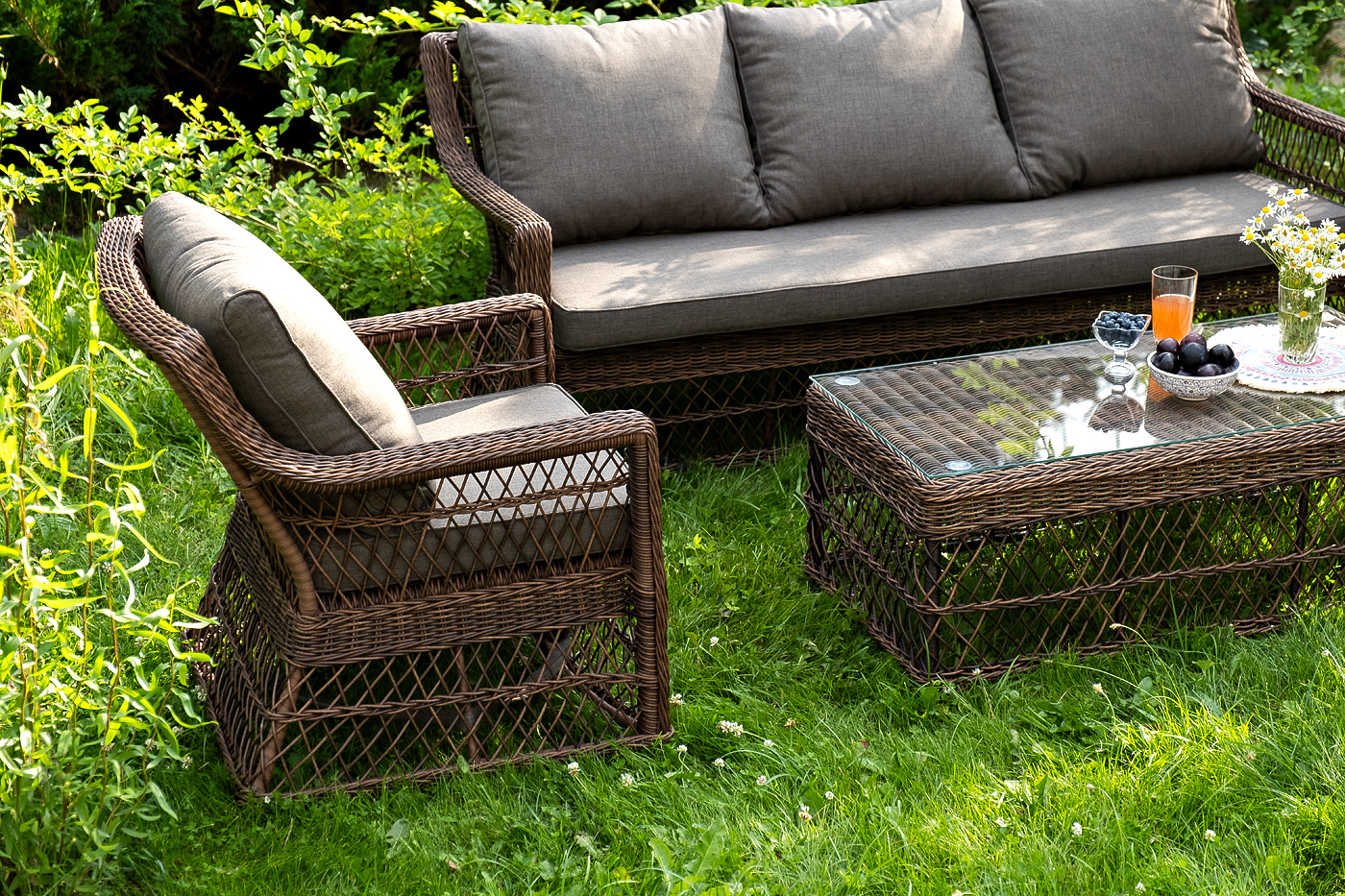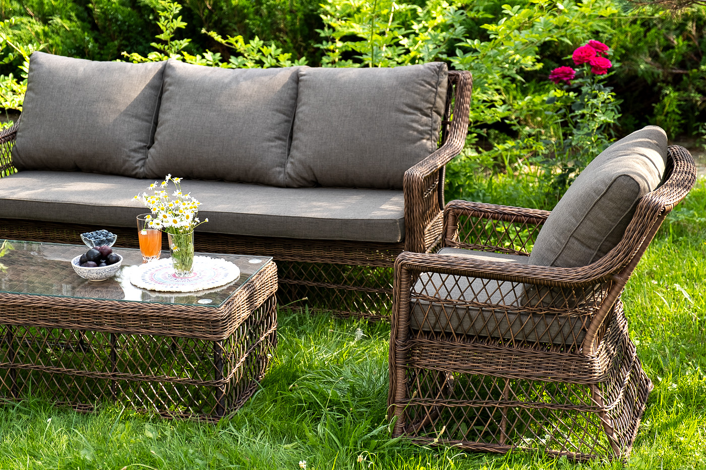 Уличная мебель имеет алюминиевый каркас, ручное плетение, сделанное из коричневого искусственного ротанга. Предусмотрены мягкие подушки из полиэстера серо-коричневого цвета с плотностью 230гр/м2. Они имеет влагоотталкивающую пропитку. Рабочая поверхность столика изготовлена из закаленного стекла толщиной 5 мм.