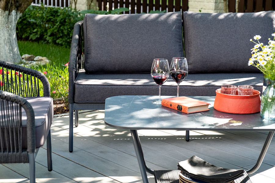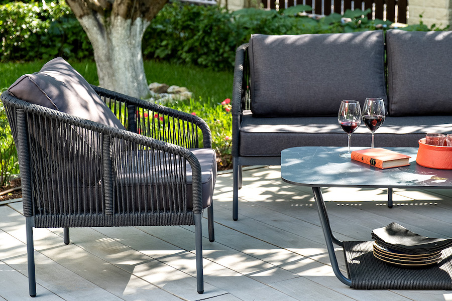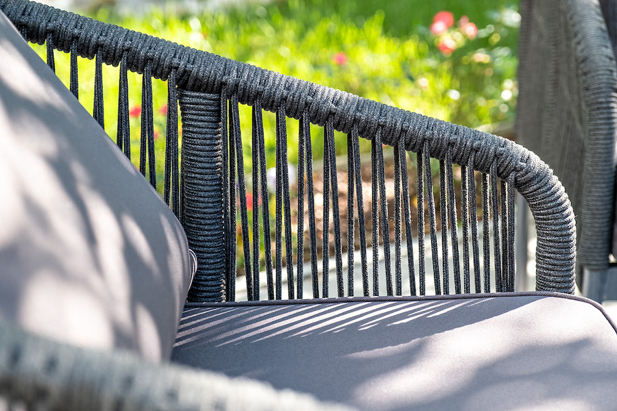Каркас уличной мебели выполнен из износостойкого алюминия. Его дополняет серая ручная оплетка, изготовленная на основе эластичных синтетических лент из полиэфирных волокон высокой прочности.